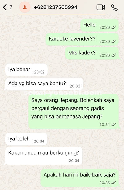 こちらがラベンダーカラオケのママ(あるいはチーママ)の連絡先。インドネシア語で話してくるので、翻訳必須。